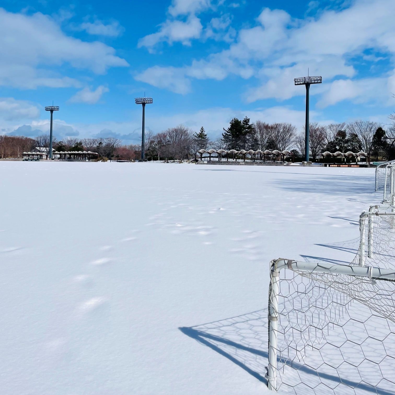 野球場側の公園の、西側芝生広場の近くとバーベキューエリアの近くに1基ずつ、計2基のバスケットゴールが設置してあります。どなたでも自由にご利用いただけますので、譲り合ってご使用ください。